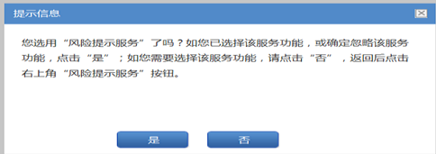 8、 點擊“申報”按鈕再次給出風險提示服務的相關提示,選擇“是”繼續申報,選擇“否”則返回列表頁面,繼續選用“風險提示服務”后再申報。