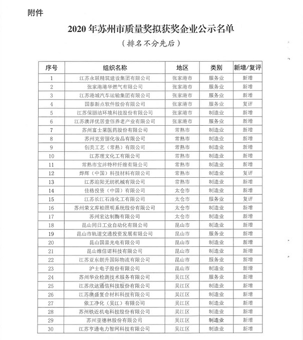 2020年蘇州市質量獎評定結果公示「智為銘略轉發(fā)」